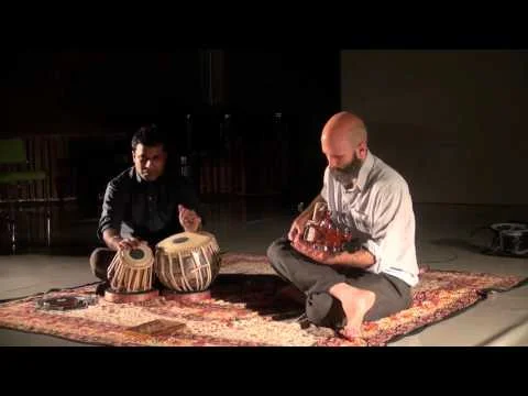 In the performance with Debojyoti, who provided the clear structure of tala , I am able to play with the groove more, using off-beat phrases in the composition and stretching with and around the sam (from 8:40-9:53 and also from 10:32-11:01). Not only sonically, but gesturally, the tabla provides a clear framework. As the nine beat cycle revolves, the kali is signified by the absence of a bass note on the bayan or left side of the pair of drums. The final phrase of the cycle, Dhin dhin na Dhin dhin na is a dramatic gestural flurry which clearly leads to the clear and resounding sam. Through these bodily signals, combined with their sonic manifestations, we are able to bend and stretch the main pulse of the rhythm and melody, making improvisations which play with the accented first beat (sam), with a constant gestural and musical structure with which to return. Also Debojyoti gets a chance to improvise, which would be a traditional part of modern raga presentation (from 10:02-10:32). This improvised section is communicated between us with some difficulty via head nods.
