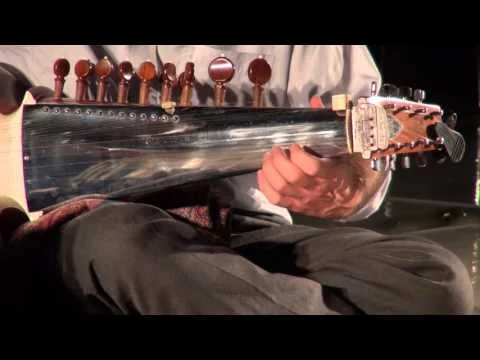 With Tommy, I played the piece as an unaccompanied slow air with a D drone played by an accordion on the loop pedal (from 0:07-2:21).[26] I utilize the open drone strings of the sarode to begin the piece, much like in an alap, and also strum these open strings in between sections of the air. Most of my pick technique is down strokes, with occasional passages of up strokes for a softer effect. Very little deviation from the melody itself takes place, and is more used in the second round of the air (for rhythmic cadences example 1:34-1:44 and ornamentation on slides for example 1:57-2:04). I am conscious when playing a slow air, that it is not like an alap in Indian music, in that it is a fixed melody, often with its origins in a song. Improvisation can take place up to a point but the essence of the air cannot be lost. From my listening of other musicians performing airs, especially Tony Mac Mahon, Junior Crehan and Willie Clancy, there are very few long pauses on the tonic or other expressive notes as there would be in an alap. The integrity of the song is kept in flow with minor ornamental improvisation or rhythmic/melodic cadences.